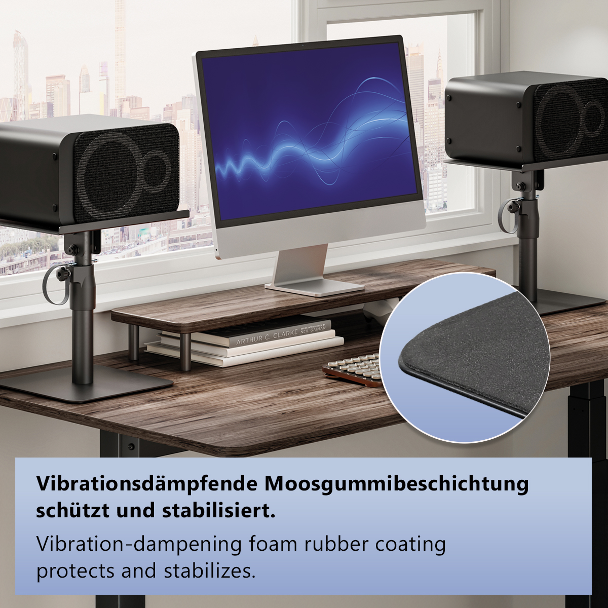 Thanks to the large 30 x 23 cm base with vibration-dampening foam rubber coating, even heavy speakers stand securely and slip-free - ideal for use on tables or shelves. The stands can be precisely aligned so that you can easily adjust your speakers to the listening area.