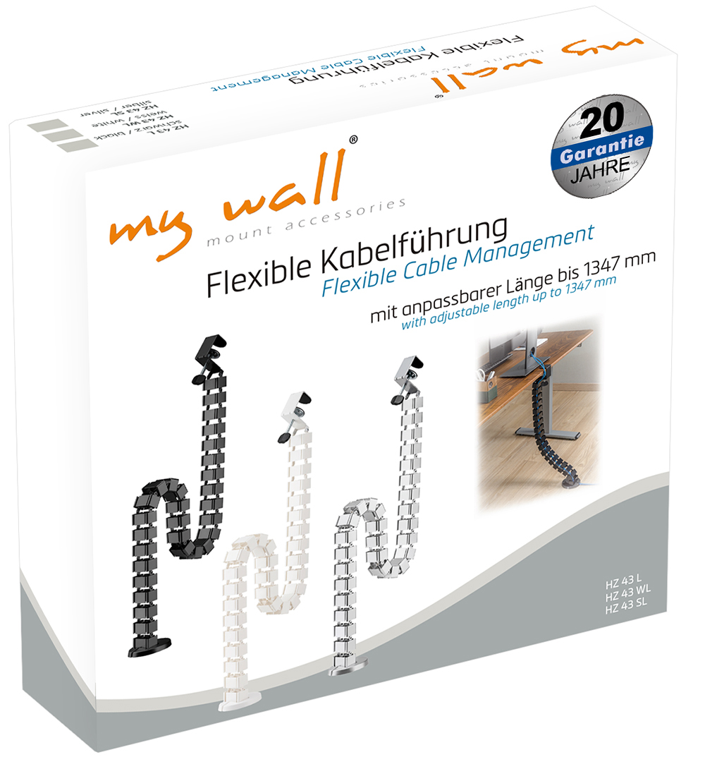 This flexible cable management system from my wall is ideal for height-adjustable desks. The cable duct can be used up to a length of 1347 mm. If required, it can be easily shortened by cutting off individual swivels.