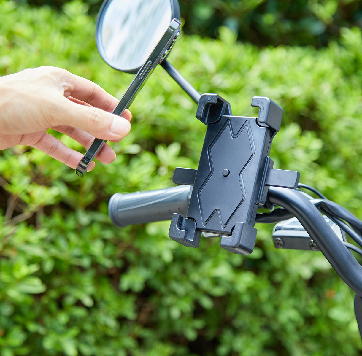 You can mount this cell phone holder on your bike handlebars, but also on other round objects such as the mirrors or steering wheel of your scooter or motorcycle.