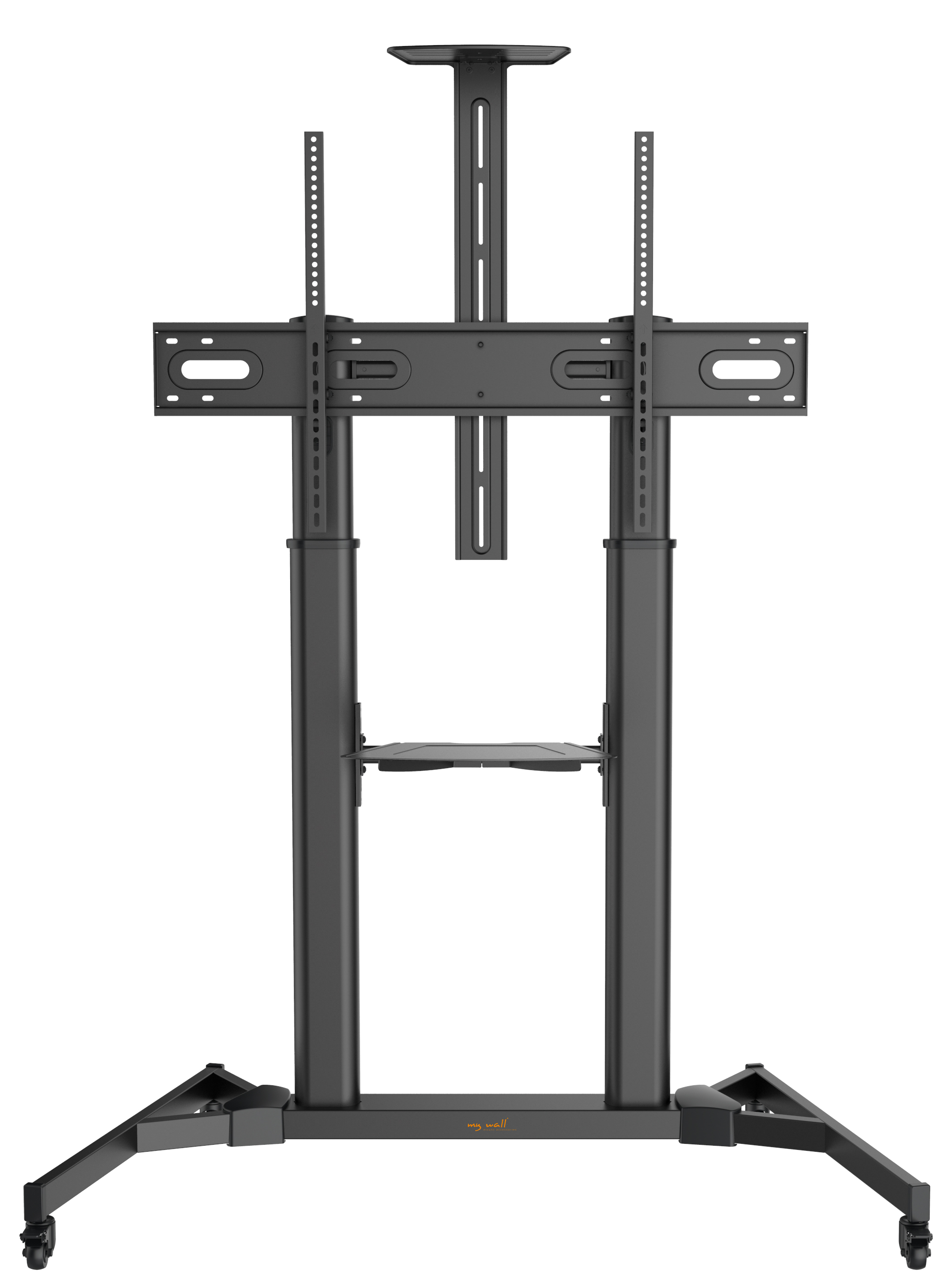 Rollable TV stand suitable for large televisions from 60“ to 100” (152 - 254 cm) with quick-release fastener for fast installation. Thanks to the quick-release fastener, you can also remove the TV quickly and easily at any time, for example to store it safely.
