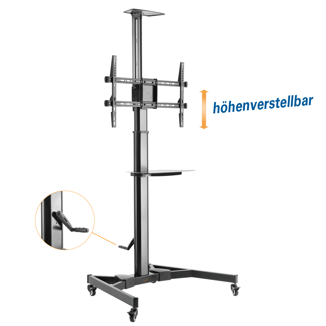 This TV stand impresses with its height-adjustable shelf for AV devices as well as the height-adjustable camera mount. This movable stand is absolutely multifunctional!