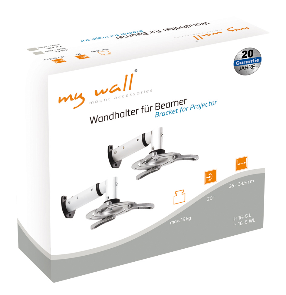 Ideal adjustable wall mount for all common projector models. With this my wall bracket, you can easily attach a projector to the wall. This makes it ideal for rooms with sloping or particularly high ceilings. The tilt can be adjusted by 20° using a finely adjustable ball joint. This allows you to perfectly adjust the beam angle. The distance from the wall can also be adjusted from 26 cm to 33.5 cm.
