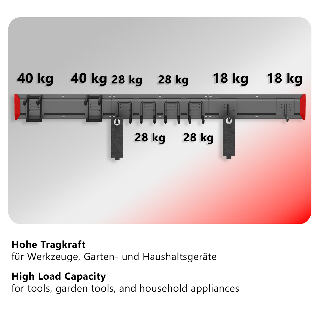 - Load capacity per single hook 18 kg
