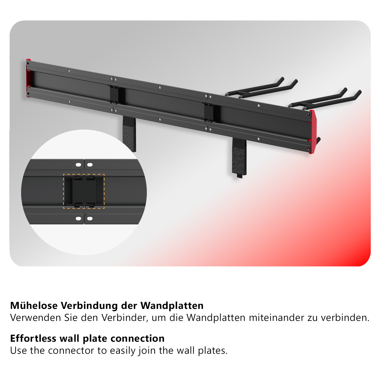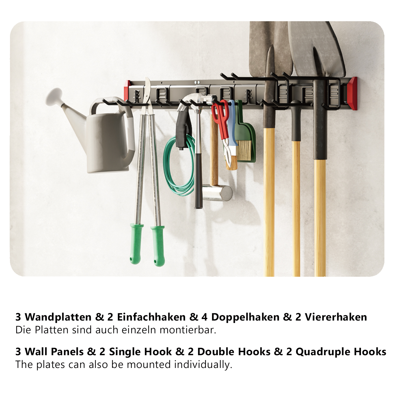 The versatile tool holder consists of three wall panels, each 40,6 cm long, which can be mounted together or separately. With a total length of 122,2 cm, this holder offers generous space for a wide variety of equipment. Whether as a garden tool holder for rakes, spades and shovels, as a broom holder in the utility room or for tools in the workshop, the system adapts flexibly to the location of use.