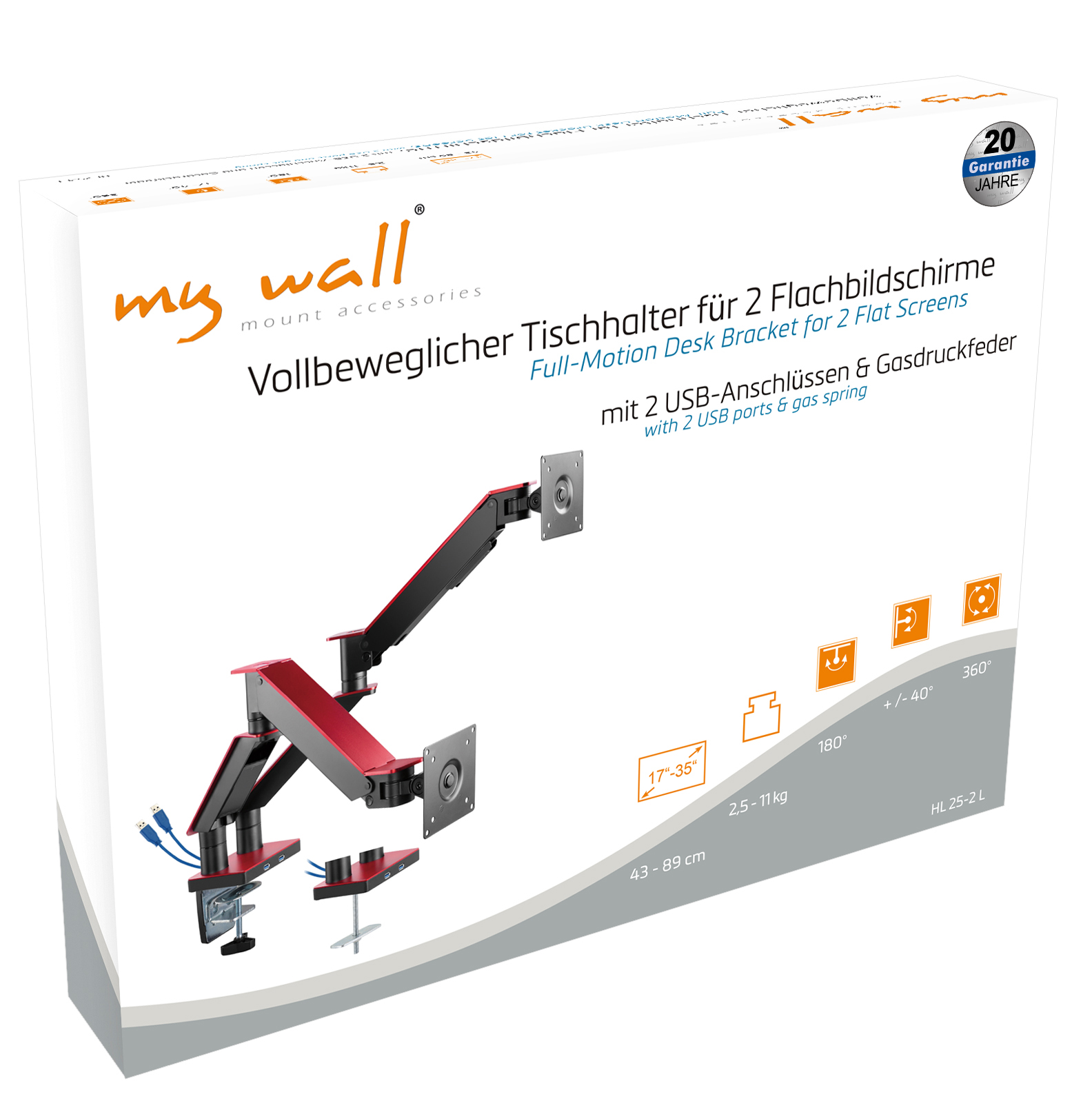 Fully mobile mount for 2 monitors in stylish high-gloss red with 2 USB ports. This monitor holder completes your workstation or gaming setup. The additional USB 3.0 ports allow quick access to external devices without anyone having to get under the desk to connect them.