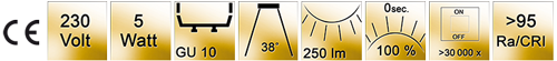 - Description: Ø 50 mm x 55 mm, 230V, 5 W, 250 lm, GU 10 socket energy efficiency category A
