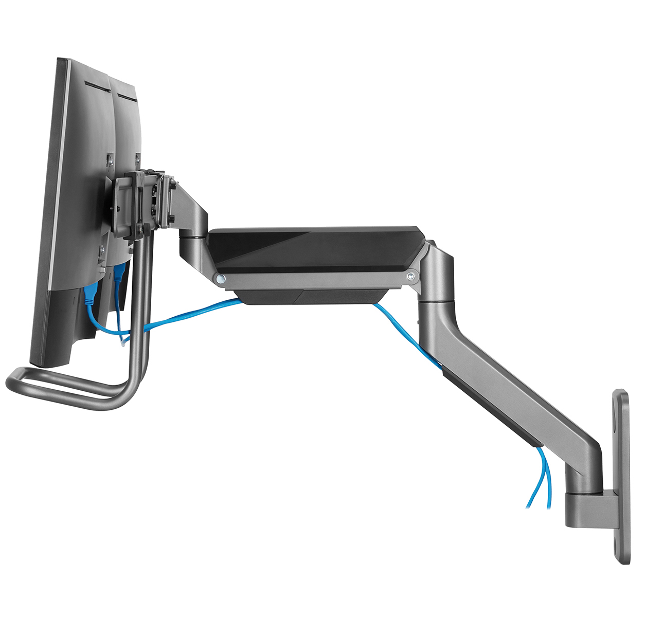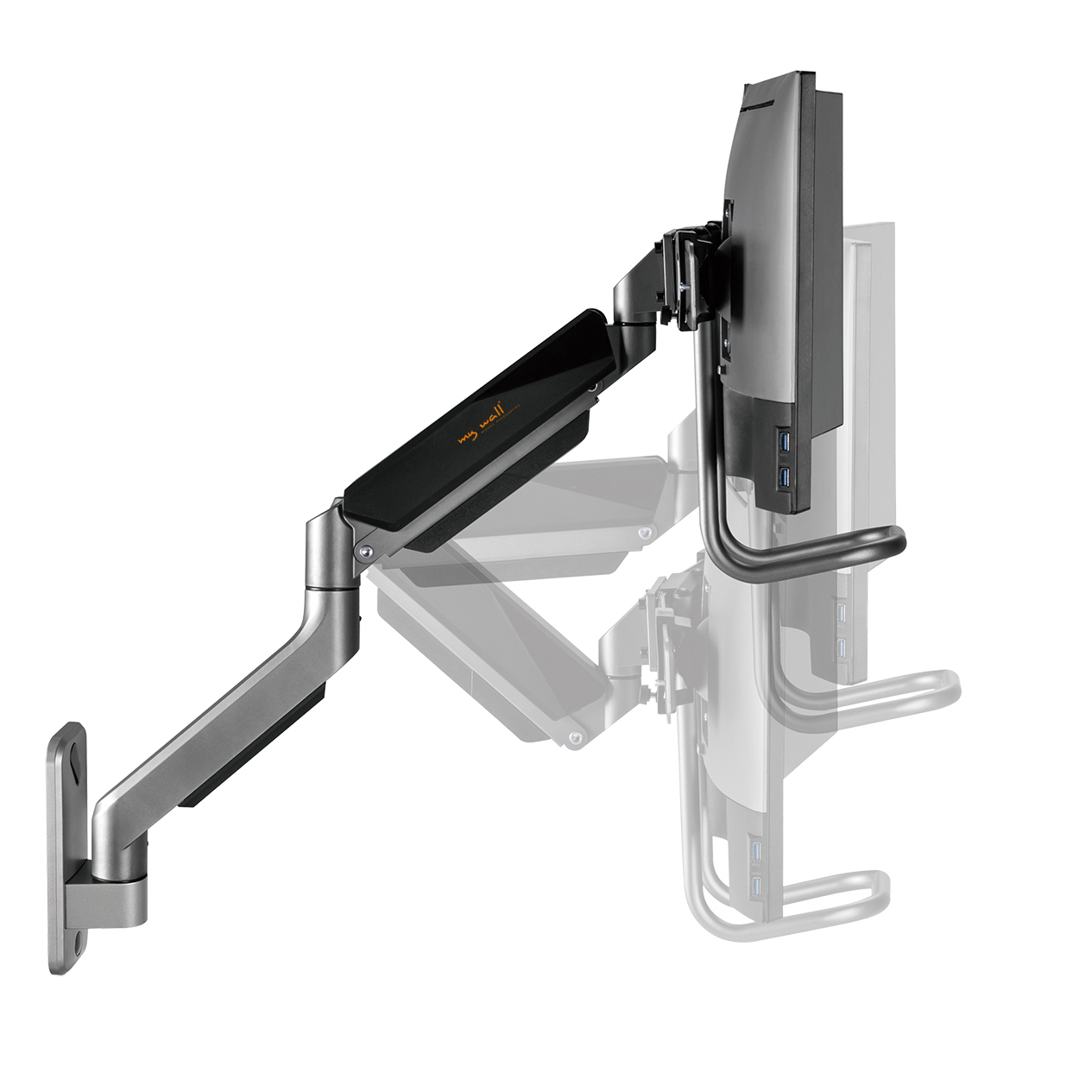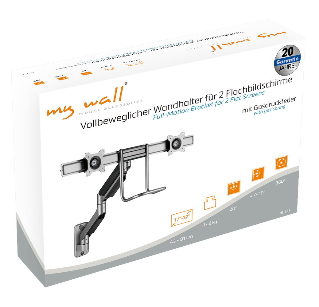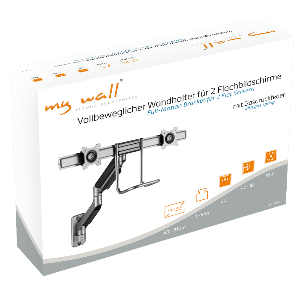 Vollbeweglicher Wandhalter für 2 Monitore. Diese Halterung ist nicht nur mit einem Griff höhenverstellbar und schwenkbar, sondern die Bildschirme lassen sich auch einzeln neigen und um 360° rotieren. Die eingebaute Gasdruckfeder sorgt hierbei für eine reibungslose Manövrierfähigkeit. Jeder Bildschirm-Arm kann einen 17“- 32“ (43 - 81cm) großen Bildschirm tragen und sind bis zu je 8 kg belastbar.