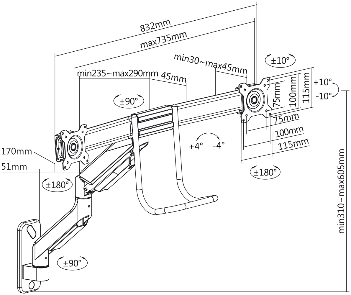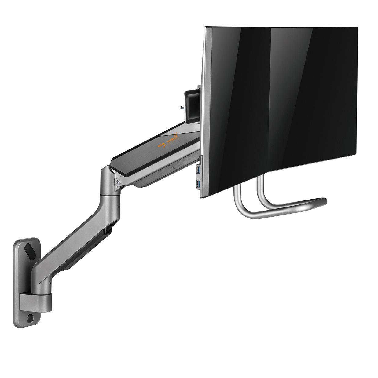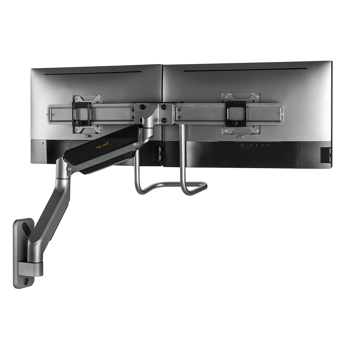 Vollbeweglicher Wandhalter für 2 Monitore. Diese Halterung ist nicht nur mit einem Griff höhenverstellbar und schwenkbar, sondern die Bildschirme lassen sich auch einzeln neigen und um 360° rotieren. Die eingebaute Gasdruckfeder sorgt hierbei für eine reibungslose Manövrierfähigkeit. Jeder Bildschirm-Arm kann einen 17“- 32“ (43 - 81cm) großen Bildschirm tragen und sind bis zu je 8 kg belastbar.