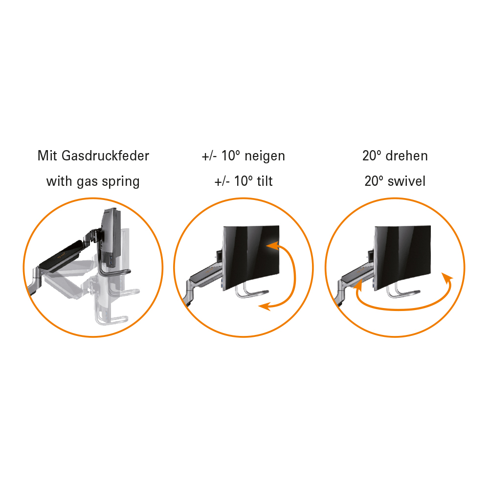 - Mit integrierter Gasdruckfeder, für eine stufenlose vertikale Ausrichtung des Bildschirms (max. 295 mm)